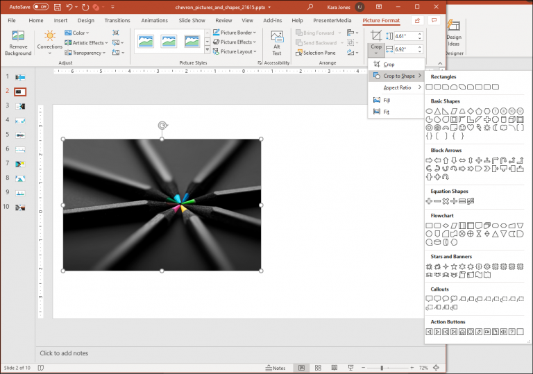 Once you’ve clicked Crop, you’ll see a dropdown that allows you to choose “Crop to Shape”. Place your mouse over this option and see the long list of shapes you can choose from!