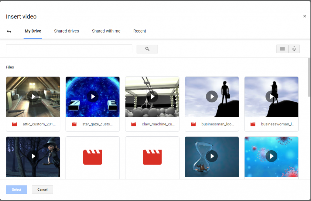 Once your Google Drive syncs to the cloud version of the program, you can insert videos into your Slides project. Simply click on "Google Drive" under the Insert Video options, and review the options under your "My Drive" results as seen below: