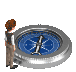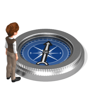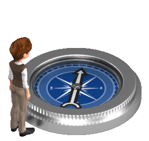 A businessman steps up onto a compass and points giving the swinging arrow direction.