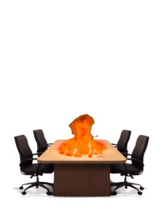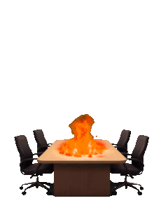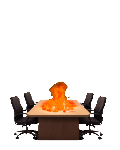 This striking animation features a fire on a conference table, capturing a dramatic scene that symbolizes chaos and urgency in a corporate environment. The flames erupting from the center of the table create a vivid visual metaphor for heated discussions, conflict, or a crisis that demands immediate attention. The surrounding empty chairs suggest a moment of tension, emphasizing the seriousness of the situation and inviting viewers to reflect on the implications of unresolved issues in a professional setting.