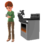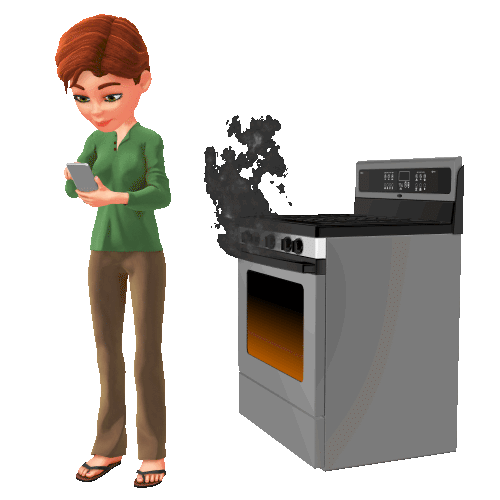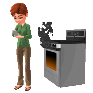 woman ignore burning oven fire smoke kitchen dinner supper lunch meal food bake cook appliance distracted busy ignore oblivious