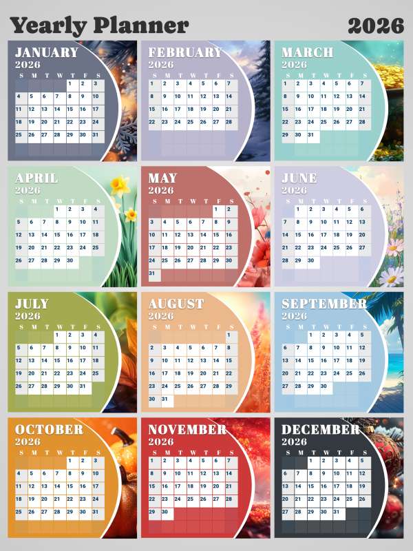 This editable calendar template is a vibrant and colorful 12-month calendar for the year 2026, organized in a grid format. Each month is represented in a distinct color scheme, featuring seasonal themes and illustrations that correspond to the months, from wintery scenes in January and February to floral designs in April and May.