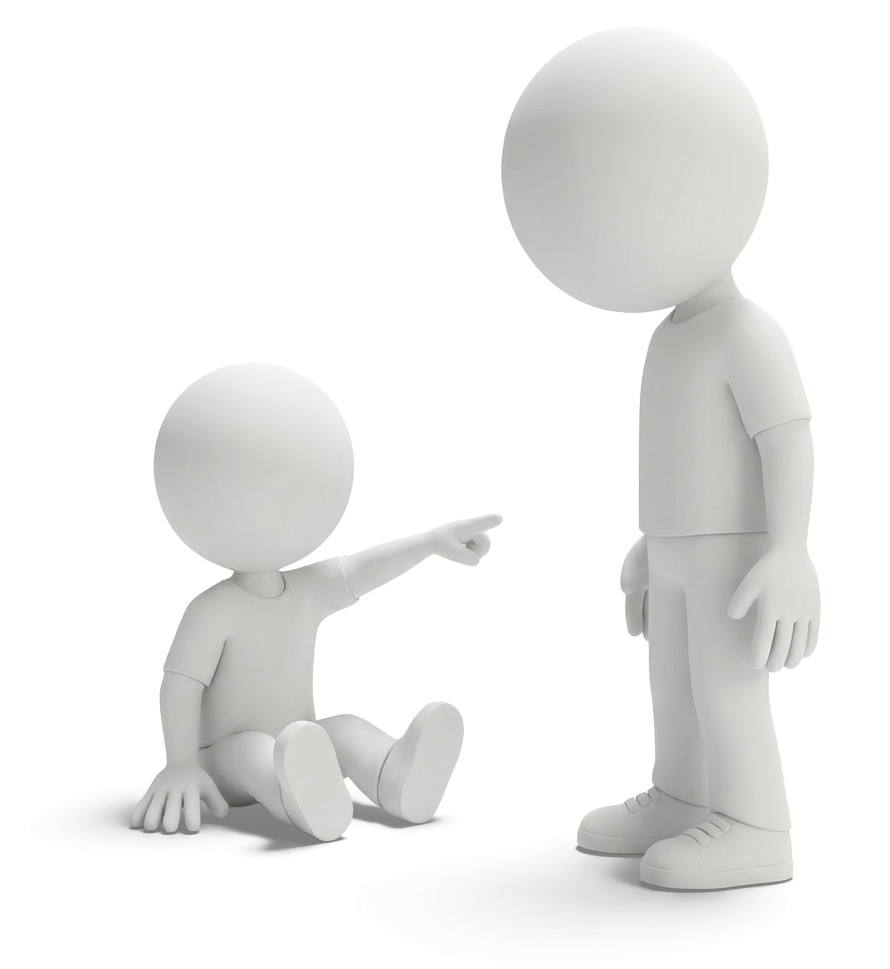 This image features a stylized representation of two humanoid figures, one sitting and pointing while the other stands upright. The childlike figure, with a round head and simplistic body, is depicted in a seated position, extending an arm to point at the taller adult figure. The adult figure, also minimalist in design, appears to be listening or observing the child. This visual conveys themes of communication, authority, and the dynamics of accusation or observation, making it suitable for discussions around childhood behavior, authority figures, or interpersonal interactions.