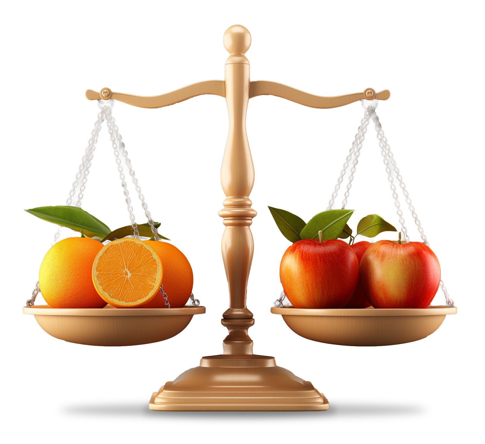 A golden scale rests balanced with oranges on one side of the scale and apples on the other. This is a visual representation of the idiom "Comparing Apples to Oranges"