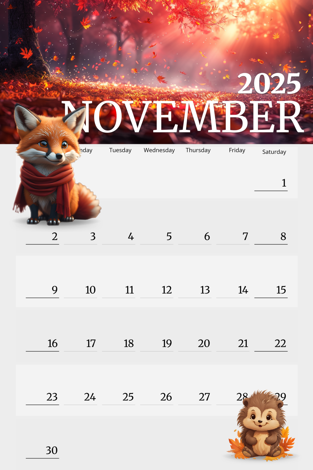 The image represents the transition into late fall, capturing the essence of November with its Thanksgiving and pre-winter vibes. It symbolizes organization and planning, as calendars are tools for scheduling events, reminders, and important dates. The fox's presence adds a playful touch to the otherwise functional design. This calendar also highlights 'Movember,' bringing awareness to men's health issues through its bold title.