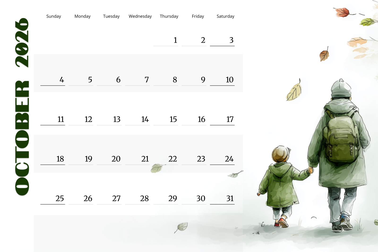 This Autumn Walk Calendar PNG image portrays a gentle scene of a parent and child walking together beneath drifting fall leaves. Soft earth tones and warm hues create a feeling of nostalgia and seasonal comfort, making it an excellent visual choice for projects centered on family, nature, or seasonal storytelling. The built-in calendar layout is designed for October and Autumn months, with clearly marked date boxes that can be used for reminders, scheduling, or decorative planning.