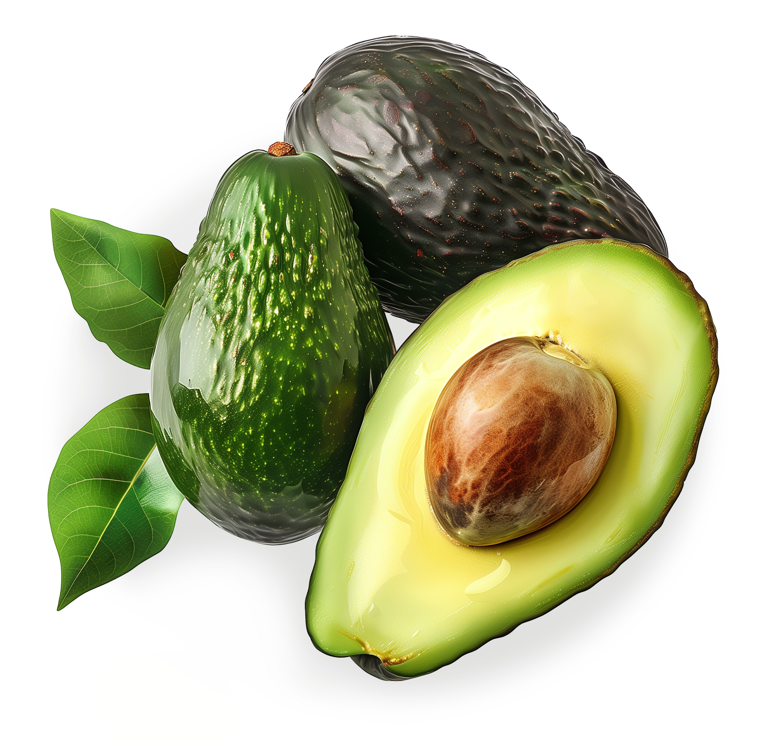 This design showcases a group of avocados, one sliced open revealing the seed inside, while two others remain whole. The avocados are ripe with a rich green color and textured skin. A few fresh green leaves accompany them, adding to the natural and organic aesthetic of the image.