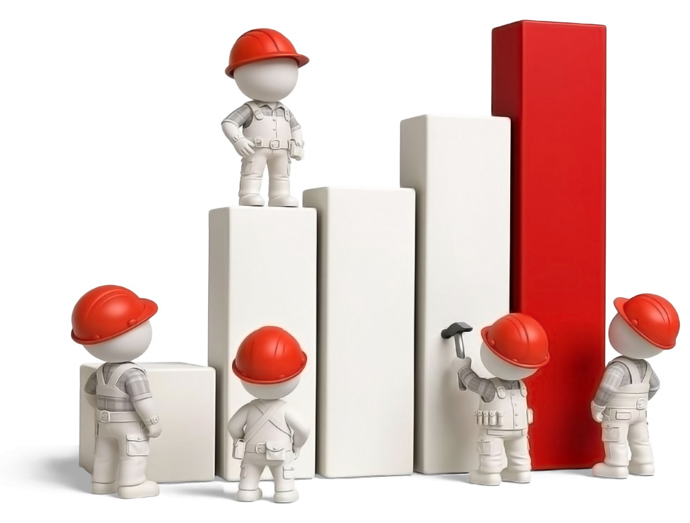 This clipart features a group of small figures, all wearing hard hats, actively engaged in constructing a large bar graph. The graph consists of several vertical bars, with one prominently displayed in red, symbolizing growth or achievement. The characters are depicted in a playful, cartoonish style, showcasing teamwork and collaboration in a construction-themed setting. This visual effectively conveys themes of progress, data representation, and the importance of teamwork in achieving goals.