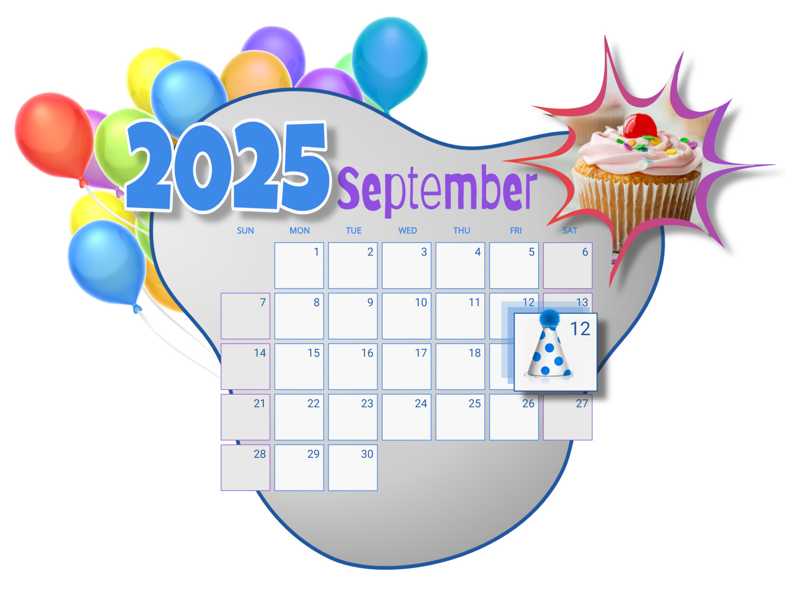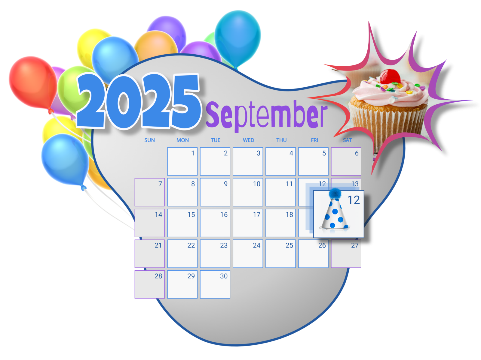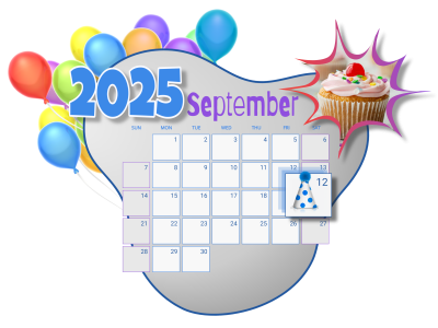 The image displays a calendar for September 2024, with a specific focus on June 12th, which is highlighted with a blue party hat icon. Surrounding the calendar are colorful balloons on the left, a cupcake with a single lit candle, and a starburst highlight on the right, suggesting celebration.