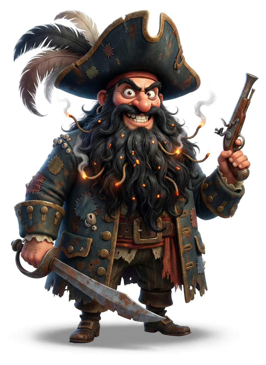 This captivating clipart features a pirate character, embodying the essence of adventure and maritime lore. With a striking appearance, the character showcases a rugged outfit adorned with patches and accessories, including a flamboyant hat and a menacing sword. The pirate's expressive face, complete with a long beard and fiery details, adds a sense of charisma and danger to the image. This clipart is perfect for presentations that aim to convey themes of exploration, treasure hunting, and nautical adventures, making it an ideal choice for engaging storytelling. Whether you're creating educational content or fun presentations, this clipart will enhance your visual narrative with its bold and adventurous spirit.