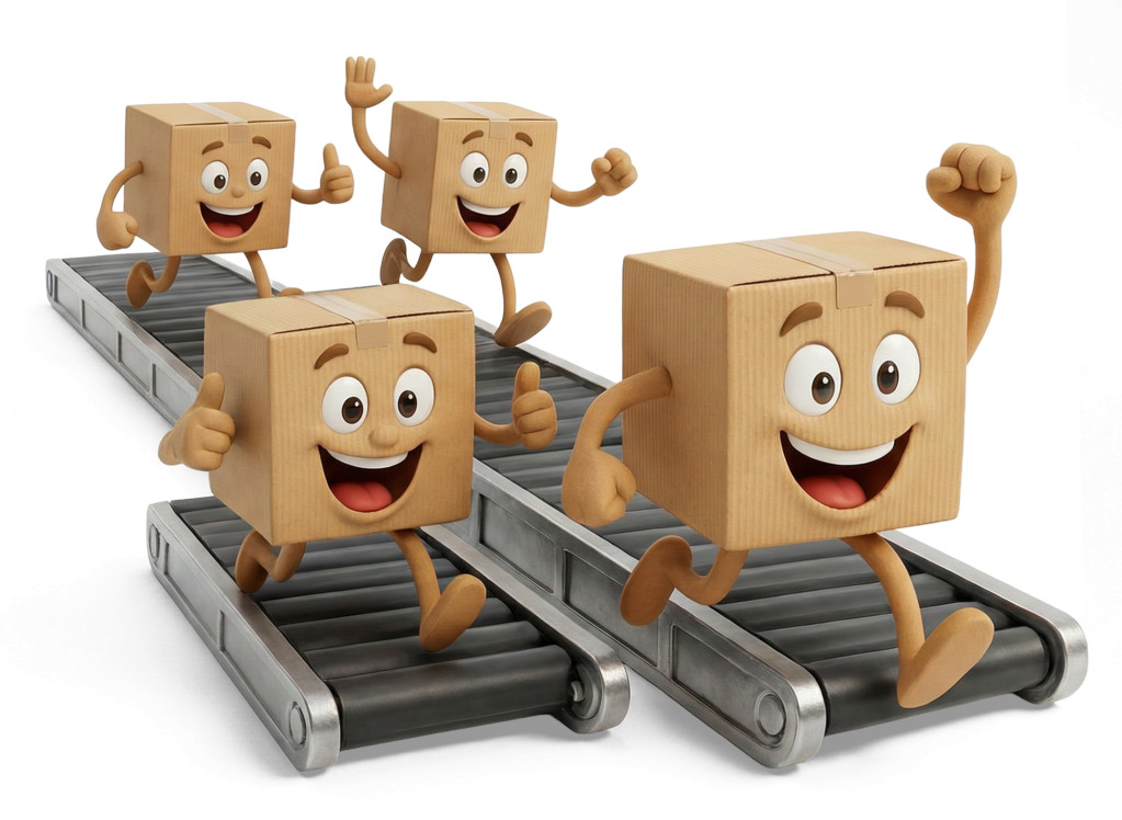 This clipart uses smiling boxes moving quickly along conveyor belts as a visual metaphor for momentum, efficiency, and smooth process flow. The conveyor represents systems that keep work moving forward without friction, reinforcing familiar metaphors and idioms such as “things are rolling,” “moving down the line,” and “a well oiled machine.” It symbolizes productivity, speed, and the positive energy that comes from efficient workflows where tasks progress naturally from one stage to the next. This visual metaphor works especially well in presentations about operations, automation, fulfillment, manufacturing, business processes, productivity, and scaling systems, helping audiences associate motion with progress and successful execution.