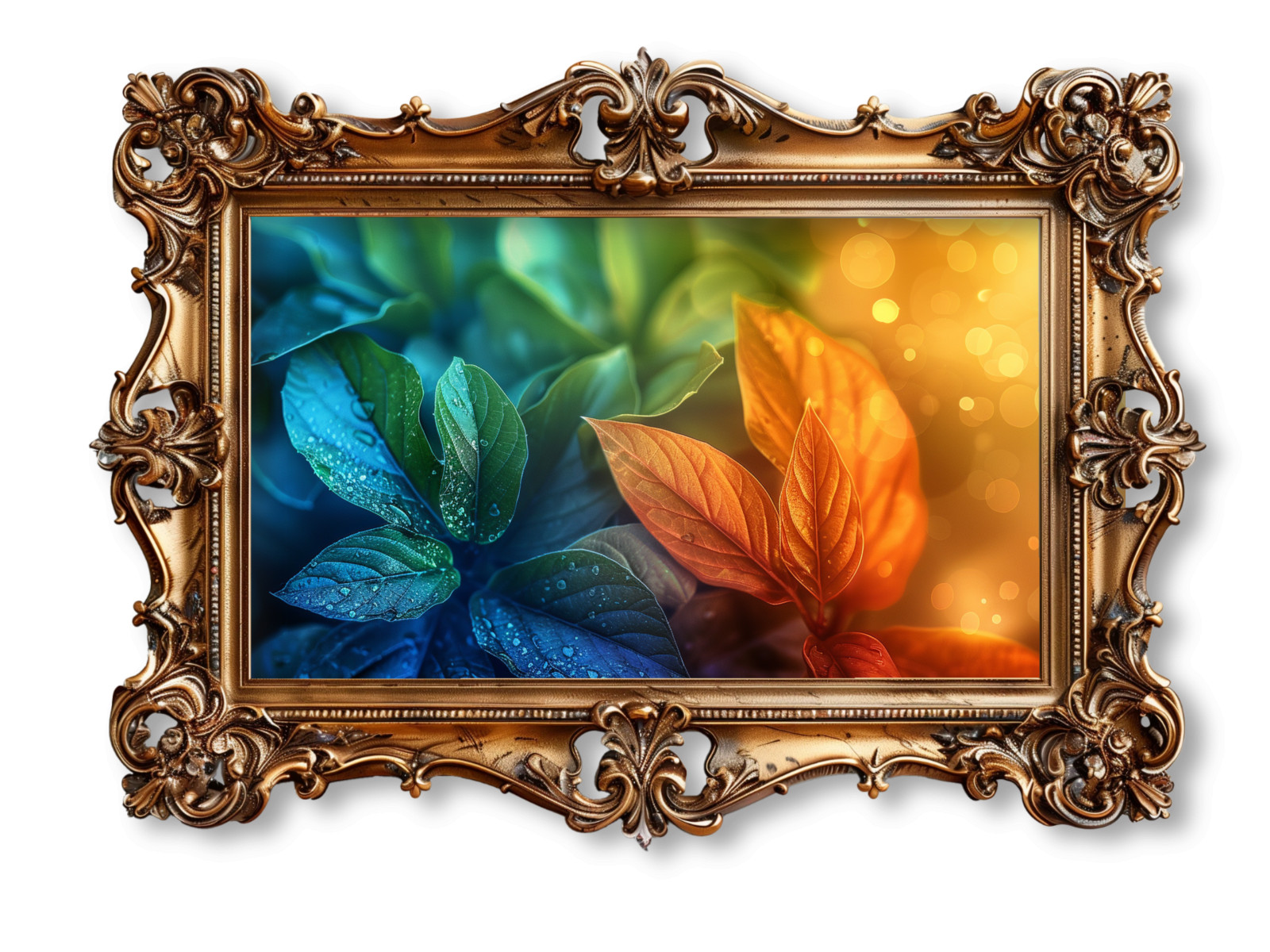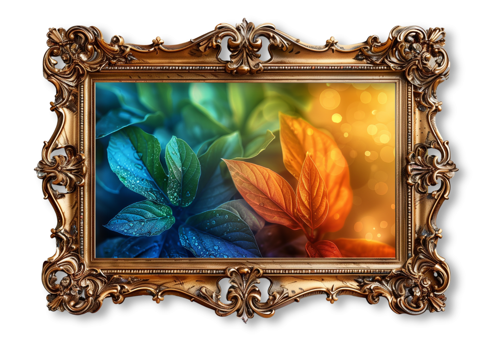 This bronze ornate photo frame clipart represents elegance and attention to detail, evoking a sense of antiquity and craftsmanship. Its elaborate design suggests it could be used in settings that require a touch of sophistication or historical ambiance. The vibrant colors within the placeholder image add contrast and interest, making it stand out as an art piece. This frame can symbolize the importance of preserving memories or highlighting significant moments.