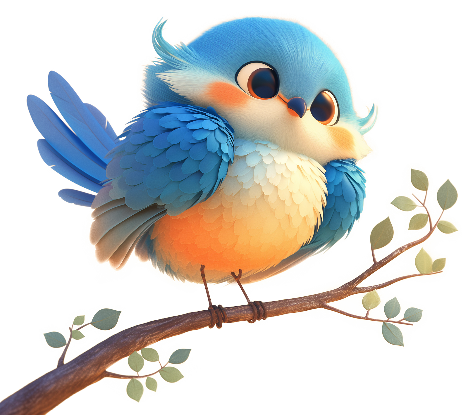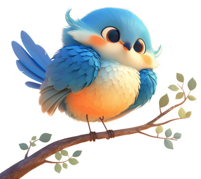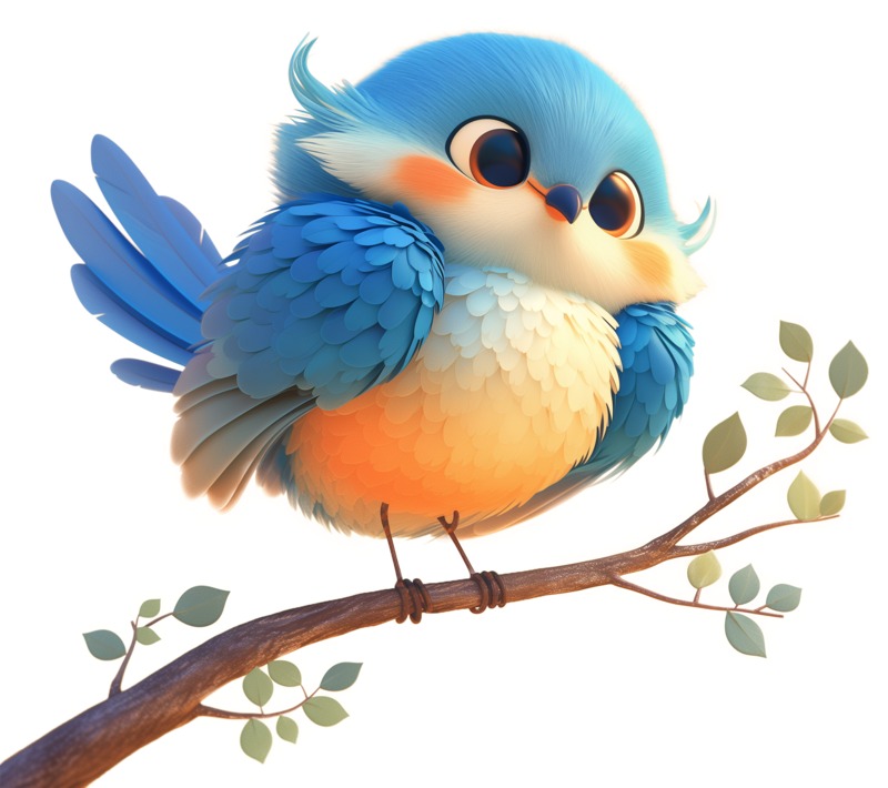 The image displays a vibrant cartoon bluebird perched on a brown branch with green leaves. The bluebird has a plump body with shades of blue on the wings and tail, and a white and orange belly. Its large eyes give it an endearing expression, making it an appealing visual for various creative projects.