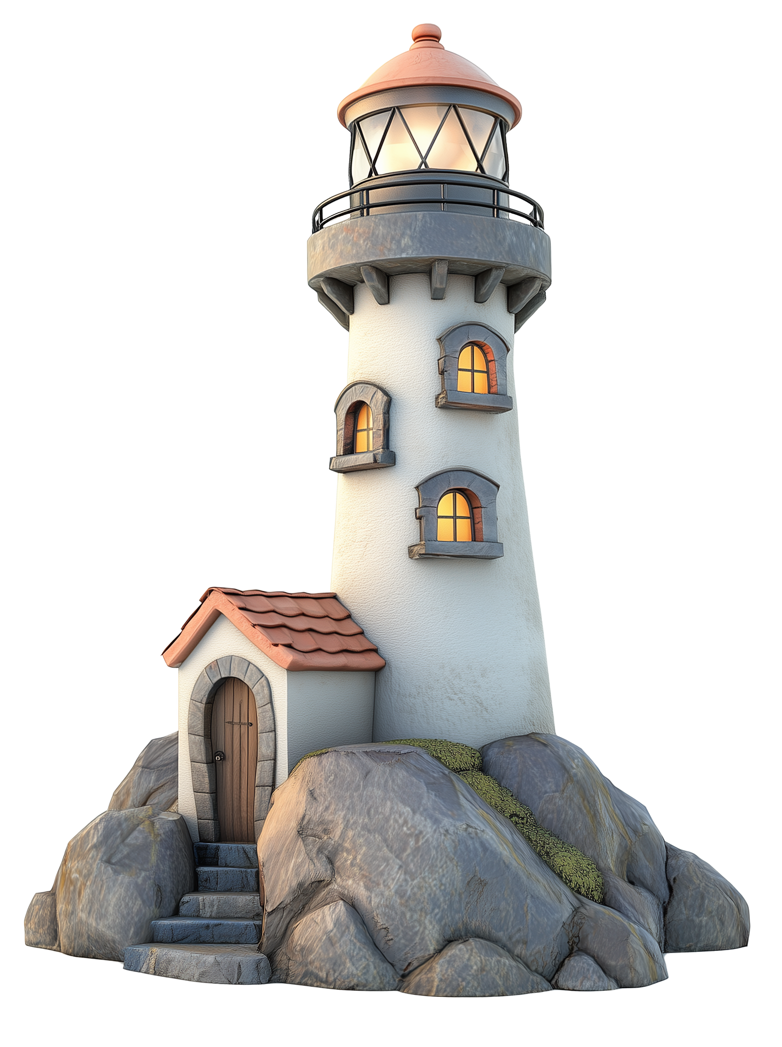 This image features a charming cartoon-style lighthouse set atop a rocky base, complete with a small adjoining building. The lighthouse has a classic design, showcasing a conical shape with a warm, inviting light emanating from its lantern, and its windows are aglow, suggesting a welcoming atmosphere.