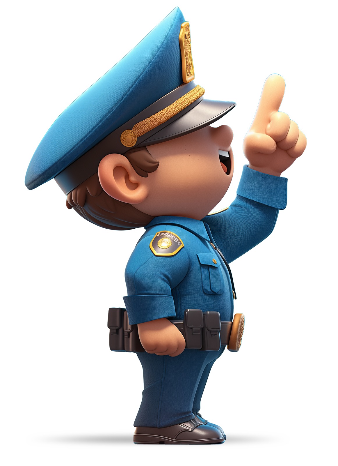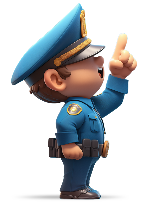 A 3D cartoon police officer in a dynamic pose pointing at the sky. The officer is depicted with a friendly expression, making it an excellent choice for presentations that aim to convey authority, safety, and community engagement in a lighthearted manner.