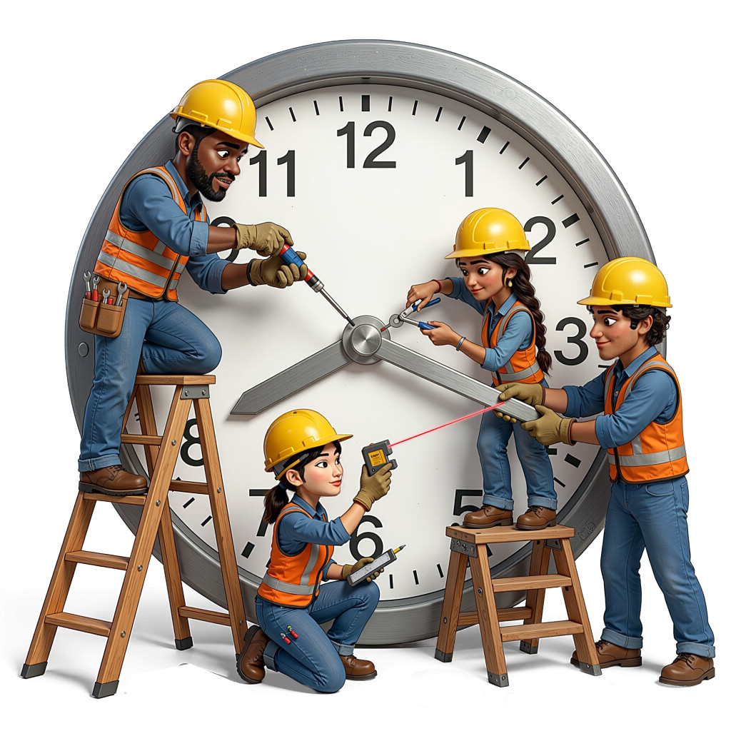 This whimsical image features a group of small construction workers humorously engaged in the task of adjusting the hands of a large clock. Each character is depicted with vibrant details, wearing safety gear such as hard hats and reflective vests, while using various tools to manipulate the clock's mechanism. The oversized clock serves as a backdrop, emphasizing the playful nature of their work, as they climb ladders and collaborate to change the time. This visual captures a lighthearted take on the concept of time management and teamwork in a construction setting.