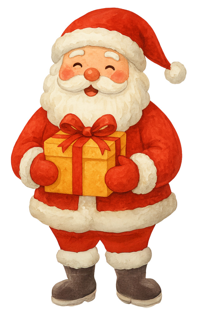This delightful clipart features a cheerful Santa holding a beautifully wrapped gift, embodying the spirit of Christmas joy. With his rosy cheeks, fluffy white beard, and iconic red suit, this Santa figure radiates warmth and happiness, making it a perfect addition to any festive presentation. The bright colors and charming design evoke feelings of nostalgia and celebration, ideal for holiday-themed projects.