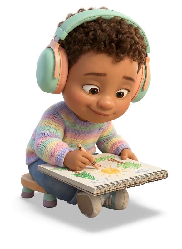 This image symbolizes the journey of growth and discovery through creativity. The act of drawing represents the exploration of ideas and the development of critical thinking skills. The headphones suggest an immersive experience, where the child is not only creating art but also engaging with their imagination, fostering a sense of wonder and connection to the world around them.