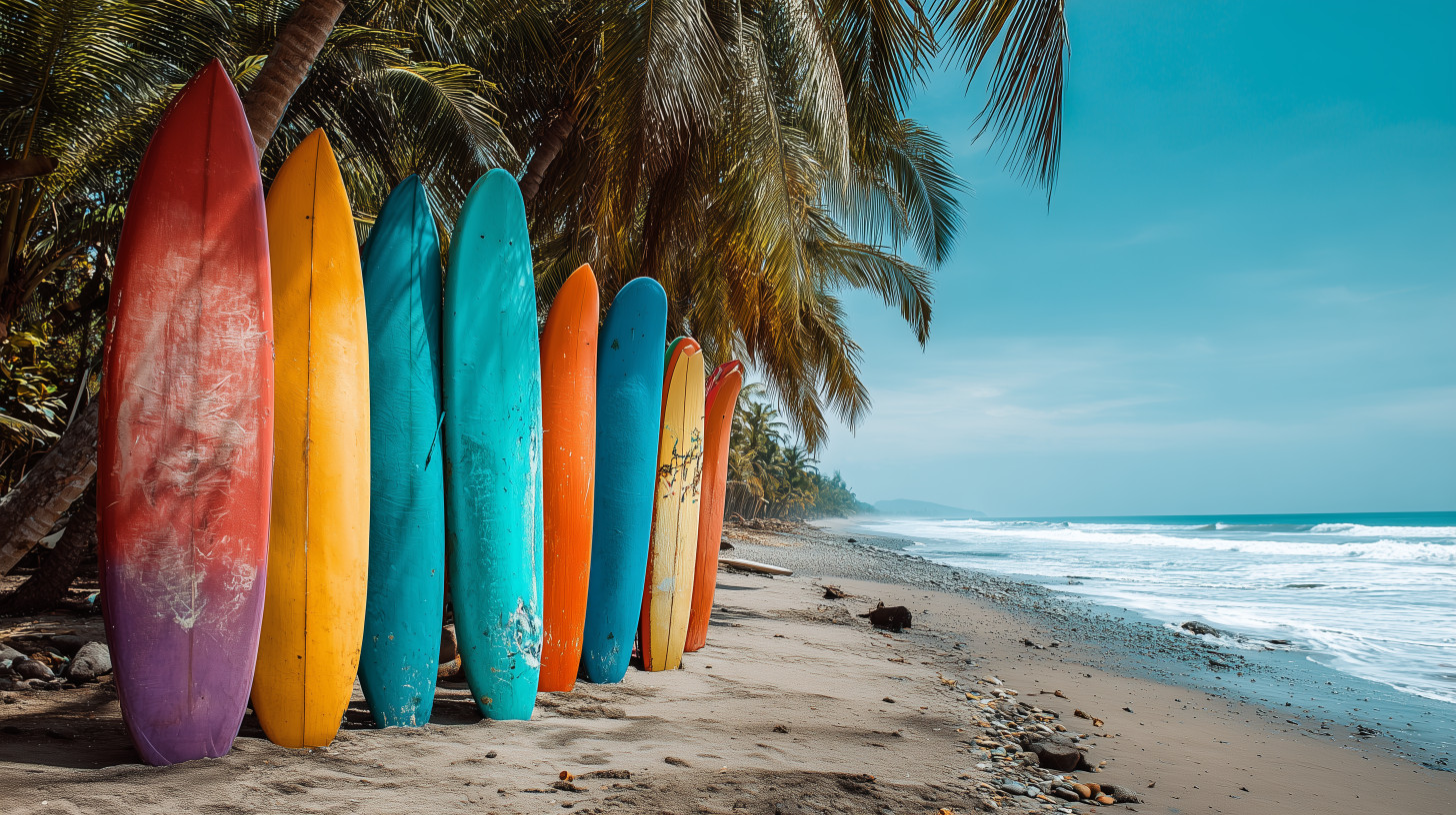 surfboards, beach, ocean, vibrant colors, travel, adventure, summer, palm trees, turquoise, red, yellow, orange, purple
