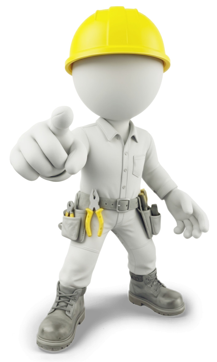 This clipart features a construction figure in a hard hat, confidently pointing at the viewer. The character is depicted in a neutral color palette, with a focus on the bright yellow hard hat that stands out. The figure is dressed in a work uniform, complete with a tool belt filled with various tools, symbolizing readiness and professionalism in the construction field. This design conveys a sense of authority and engagement, making it ideal for presentations related to construction, safety, or teamwork.