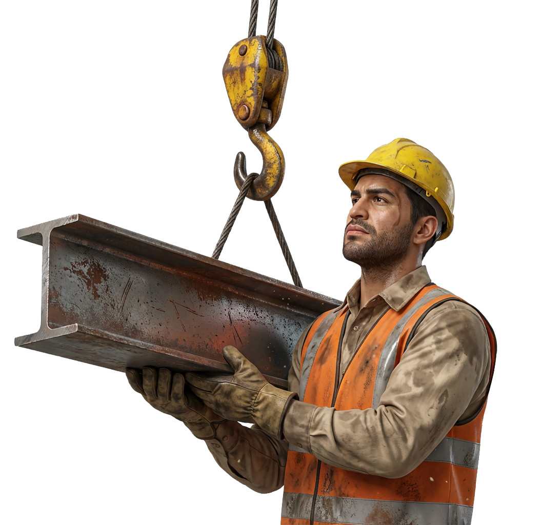 This image captures a dedicated construction worker in action, skillfully operating a crane to lift a heavy beam. Dressed in a safety helmet and reflective vest, the worker embodies the hard work and determination typical in the construction industry. The crane's hook is securely attached to the beam, showcasing the intricate balance and precision required in such tasks. The gritty details of the worker's attire and the weathered beam highlight the demanding environment of construction sites.