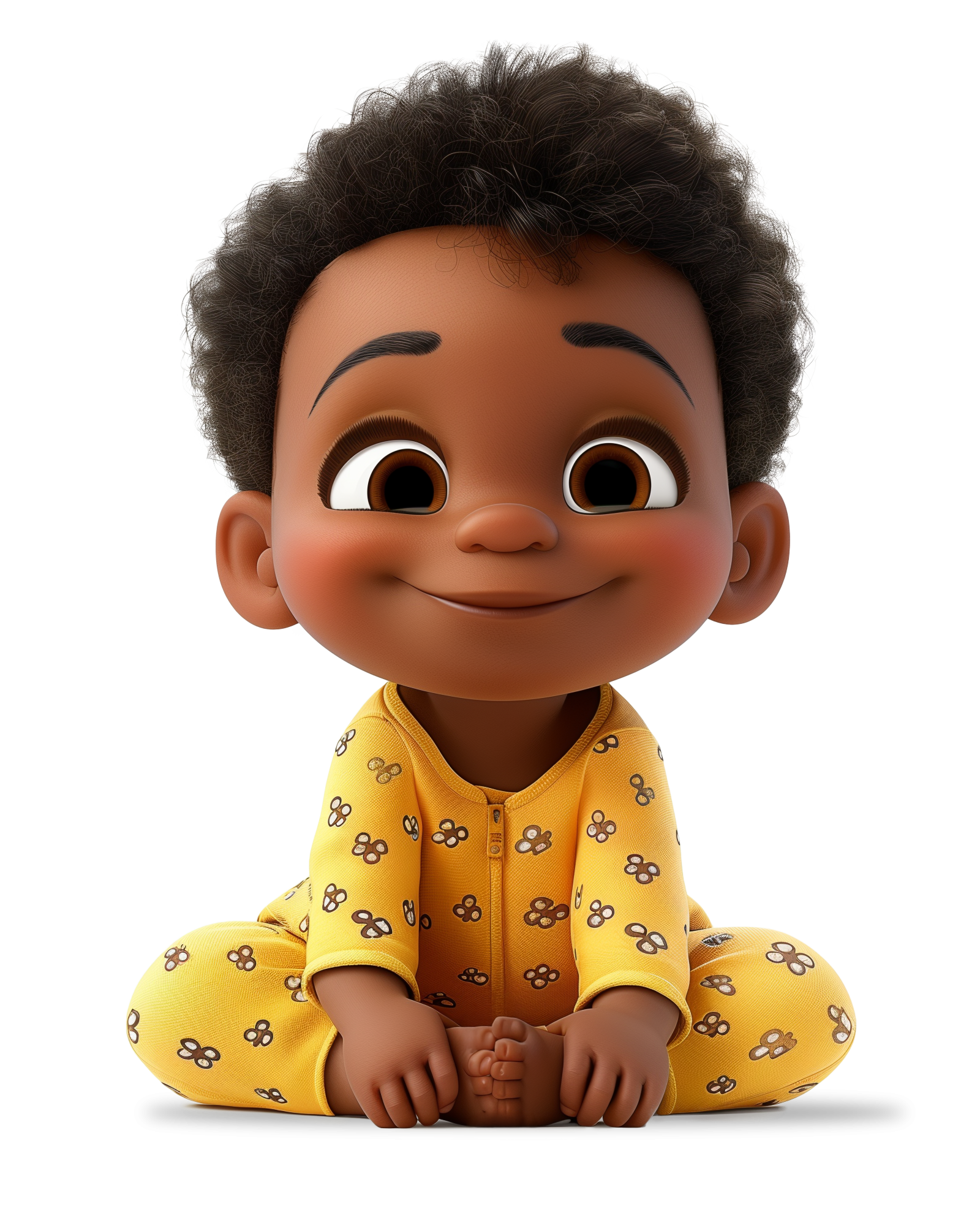 This image features an adorable toddler boy sitting with a joyful expression. He has curly black hair and is wearing a bright yellow onesie adorned with small flower patterns, adding to his charming appearance.