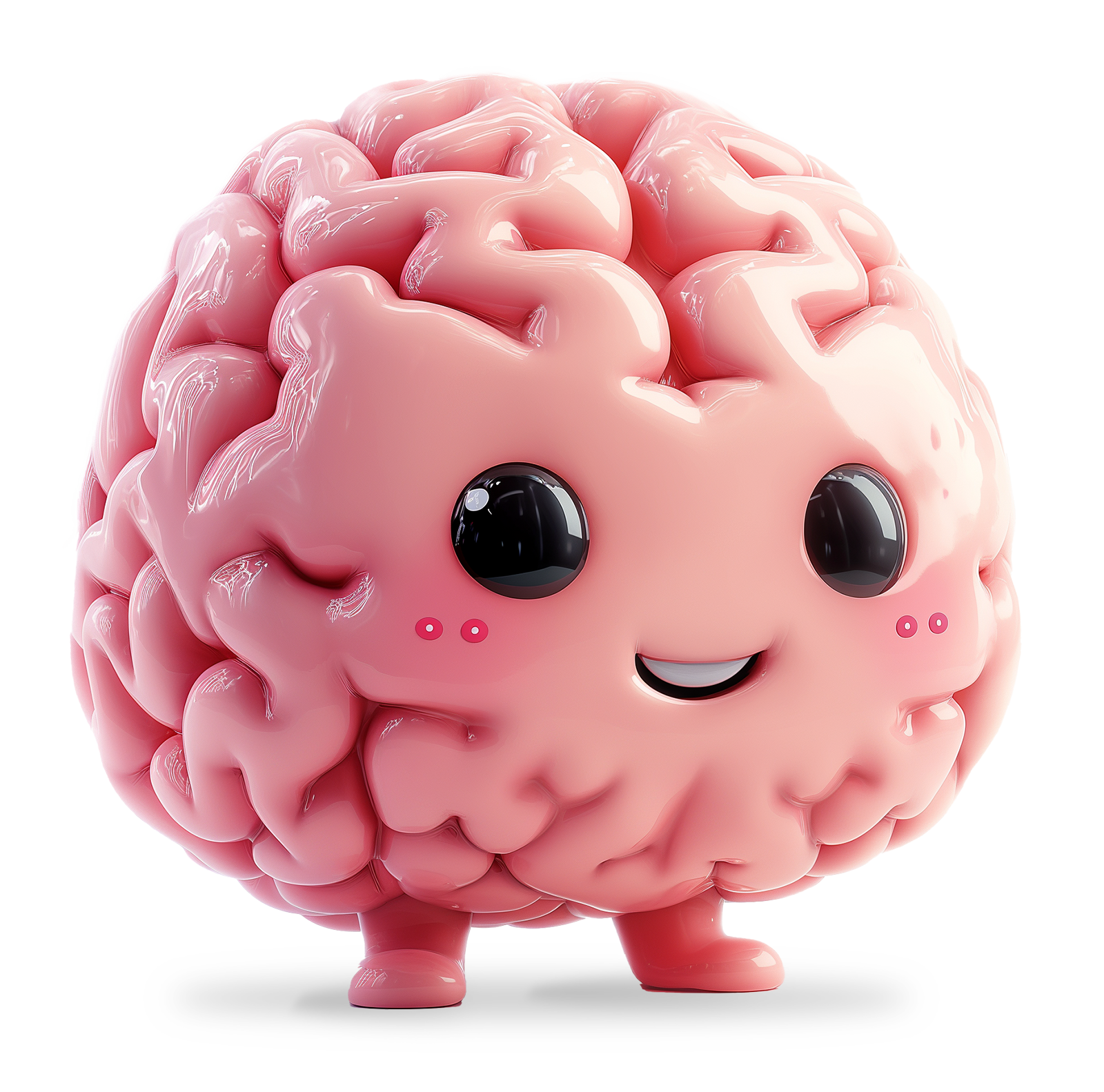 A fun 3d emoji character of the human brain that symbolizes our ongoing journey to unravel its mysteries. The brain features pink body and a happy cartoony face.