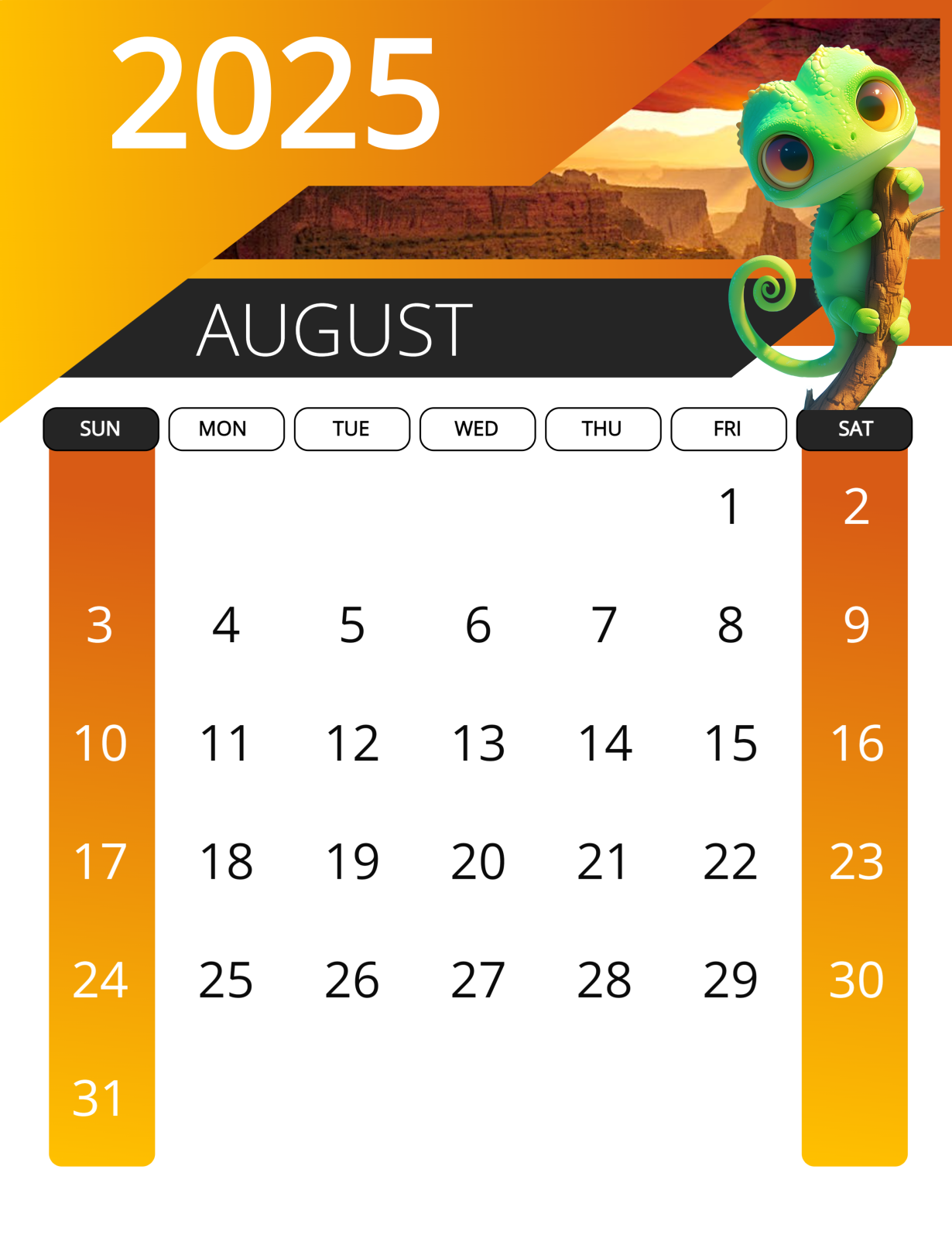 Use this vibrant editable calendar for August, set against a desert backdrop with warm orange and yellow hues. A playful green cartoon lizard character stands to the right of the calendar, which features a black header with white text for the days of the week.
