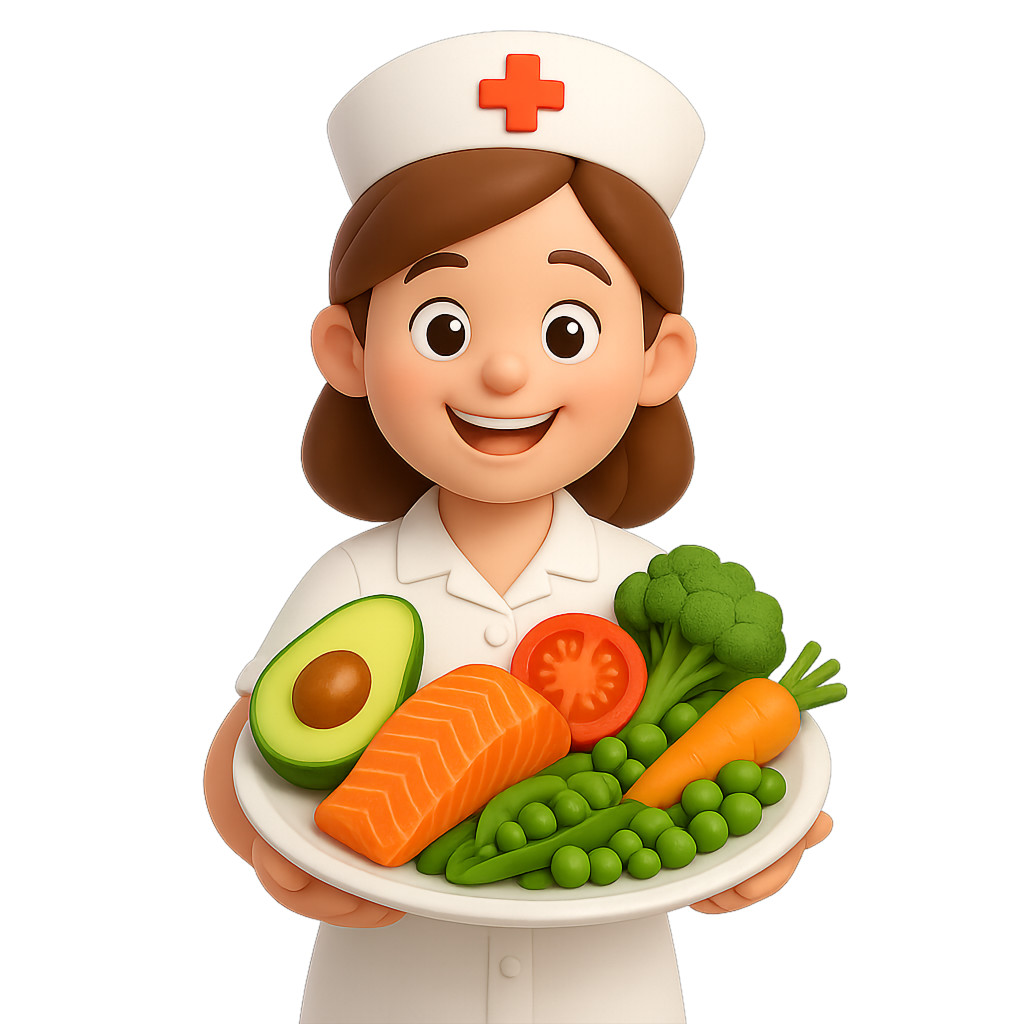 This vibrant clipart features a cheerful nutritionist holding a plate filled with an array of healthy foods, including salmon, avocado, and various vegetables. The character, dressed in a nurse's uniform, symbolizes the importance of health and nutrition in our daily lives. This engaging illustration can effectively communicate the benefits of a balanced diet and encourage healthier eating habits among audiences. Discover additional medical and health clipart options that highlight wellness topics, healthcare communication, clinical concepts, and safety-focused visuals.