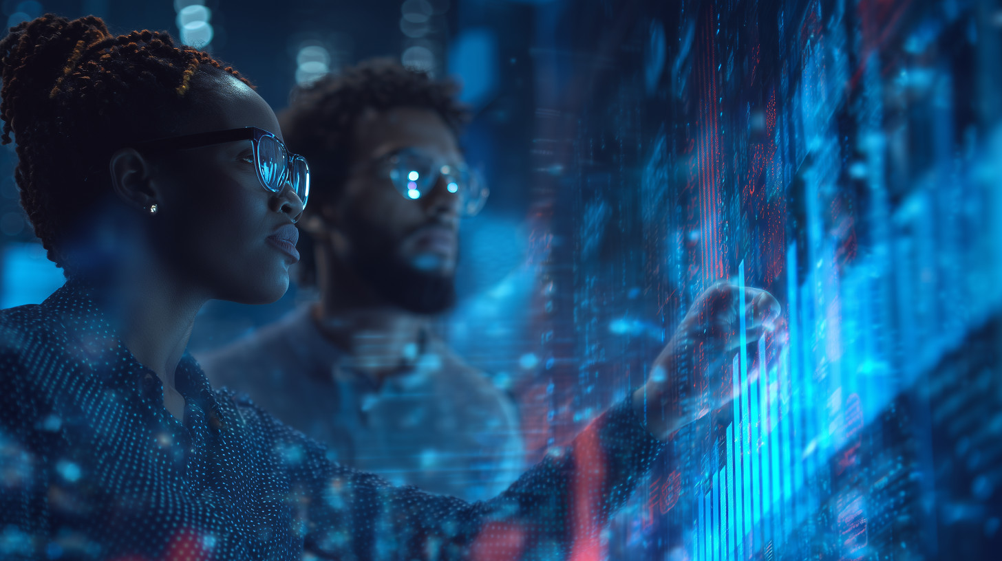 This high-resolution PNG with a transparent background portrays the concept of future investing analytics in a modern, tech-driven setting. The artwork shows professionals immersed in analyzing streams of financial data, reflecting the fast-paced world of predictive modeling, portfolio optimization, and market intelligence. With its glowing blue digital overlays and futuristic atmosphere, this clipart communicates innovation and the power of technology in shaping investment decisions. It is especially effective for presentations centered on finance, fintech, and the evolution of data-driven strategy.