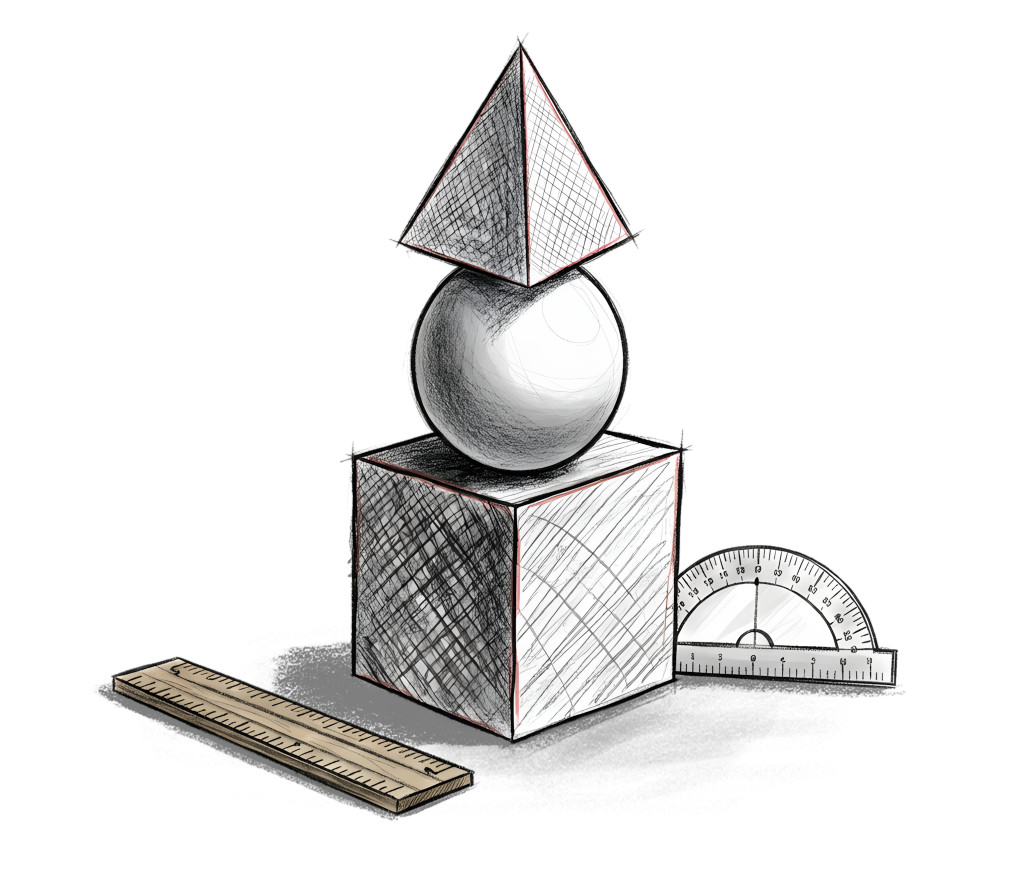 This illustration features a collection of geometric shapes including a pyramid, sphere, and cube, arranged in a visually engaging manner. Accompanying these shapes are essential school tools like a ruler and a protractor, emphasizing the educational theme. The sketchy style adds a creative touch, making it suitable for academic presentations or materials focused on geometry and mathematics.