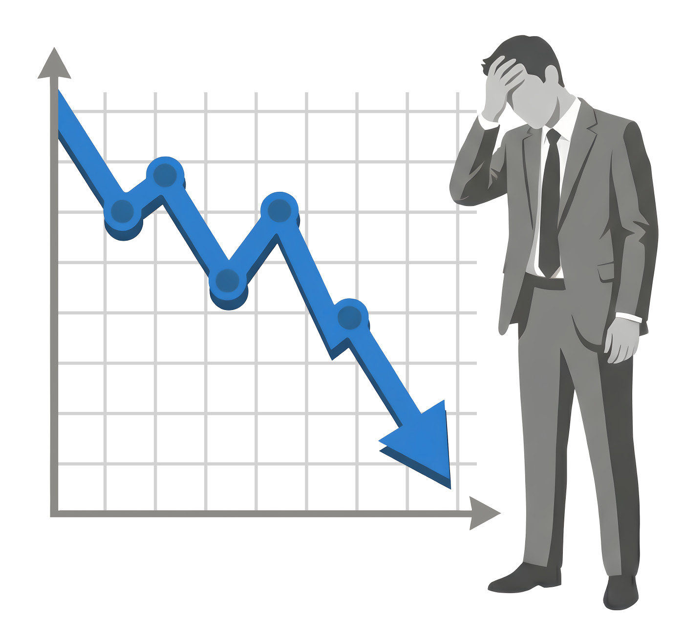 This image depicts a professional figure standing beside a graph that illustrates a downward trend, symbolizing challenges in investments and market performance. The blue arrow indicates a decline, while the grid background provides a structured view of data analysis. The figure's expression of concern emphasizes the emotional impact of market fluctuations, making it a powerful visual for discussions around financial struggles and investment risks.