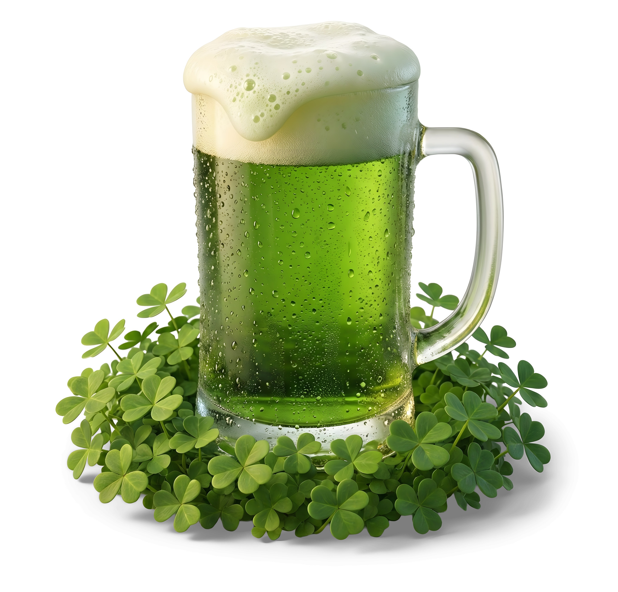 This image of green beer surrounded by shamrocks serves as a metaphor for celebration and camaraderie. The vibrant color and festive elements represent the joy of togetherness during special occasions, inviting viewers to partake in the spirit of St. Patrick's Day. It effectively communicates themes of luck, festivity, and the enjoyment of shared experiences.
