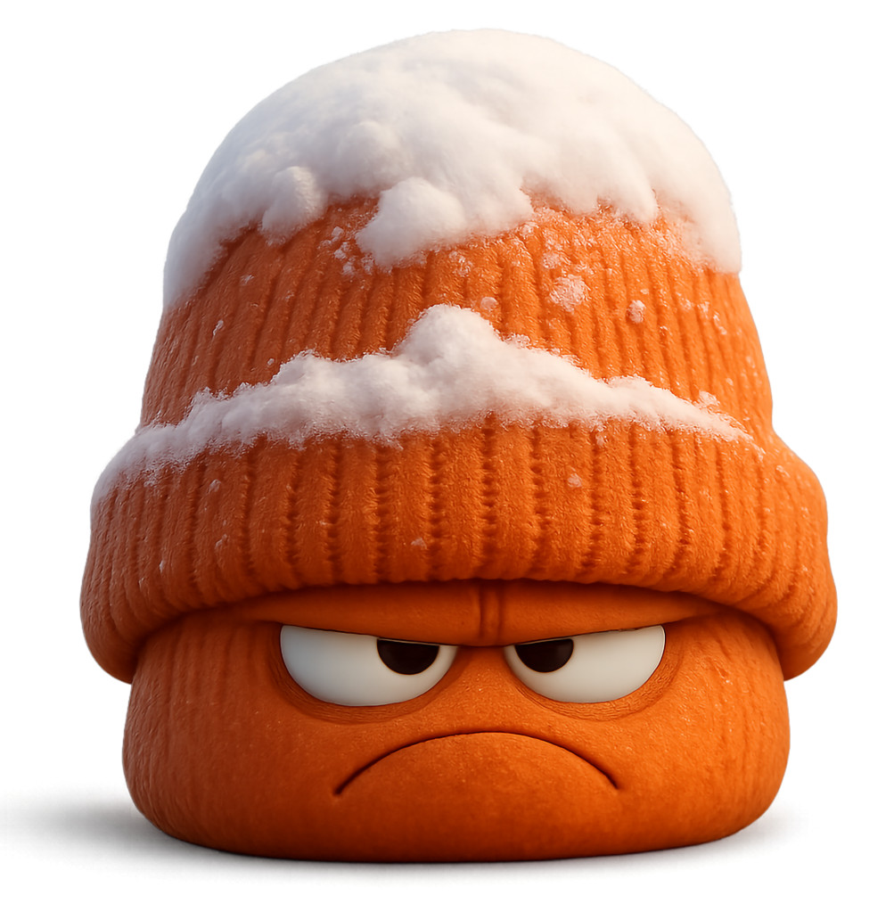 This whimsical clipart features a grumpy hat adorned with snow, showcasing a unique character that evokes humor and personality. The hat's frown and crossed eyes create a playful yet grumpy expression, making it a fun addition to any presentation. Perfect for winter-themed projects, this illustration captures the essence of a chilly day with a touch of attitude.