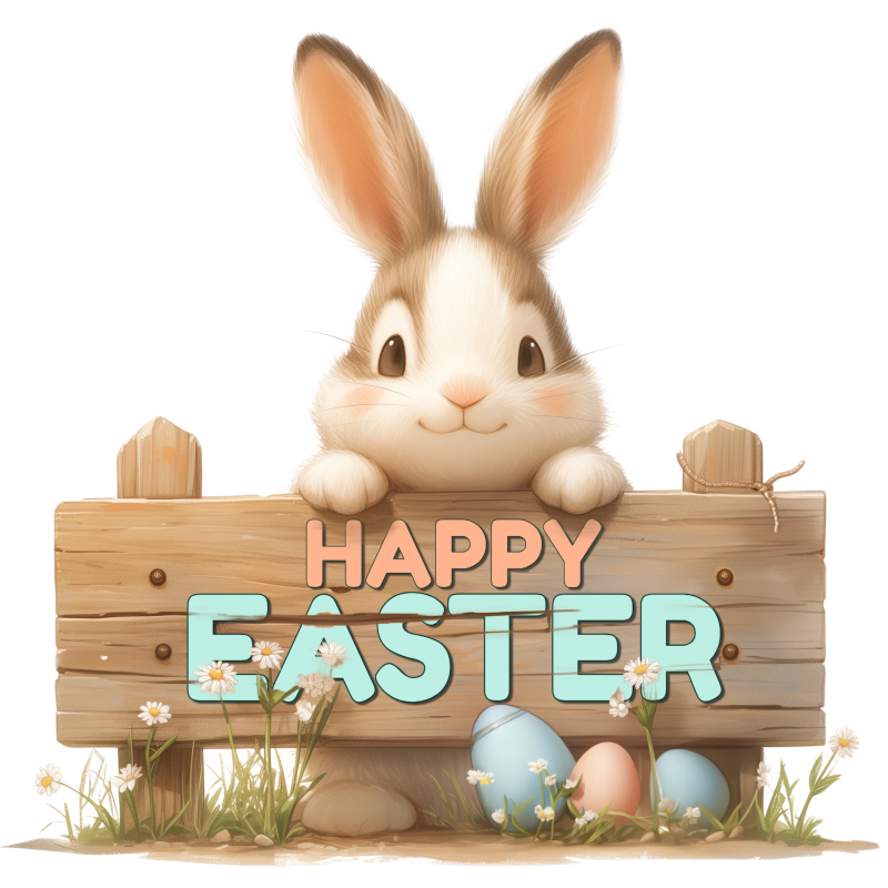 This image features an adorable Easter Bunny peeking over a wooden sign that reads "HAPPY EASTER" in bold, colorful letters. The bunny is well-detailed, with fluffy fur, large ears, and expressive eyes. The wooden sign has a rustic appeal and is surrounded by spring flowers and decorated Easter eggs at the base.