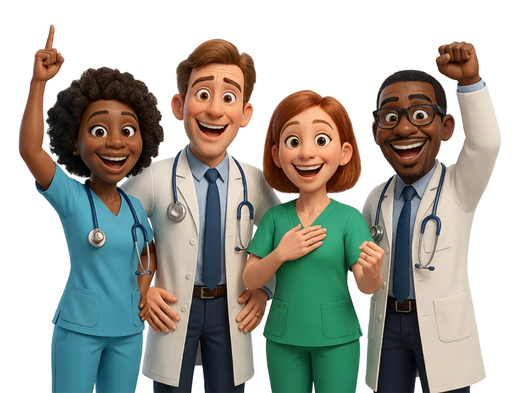 This vibrant clipart showcases a group of healthcare professionals celebrating their achievements and camaraderie. Featuring a diverse mix of characters, including doctors and nurses, each individual radiates joy and enthusiasm, symbolizing unity and teamwork in the healthcare field. The characters are depicted in colorful scrubs, emphasizing their roles while also highlighting the importance of diversity in healthcare.