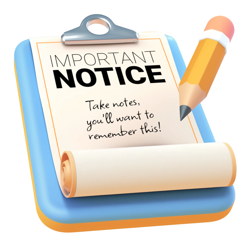 This image displays a clipboard with a white piece of paper titled "IMPORTANT NOTICE" in bold, capitalized letters. Below the title is an additional message that reads, "Take notes; you'll want to remember this!" a pencil is positioned diagonally across the clipboard.
