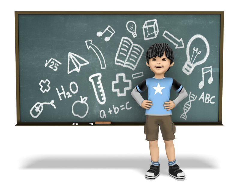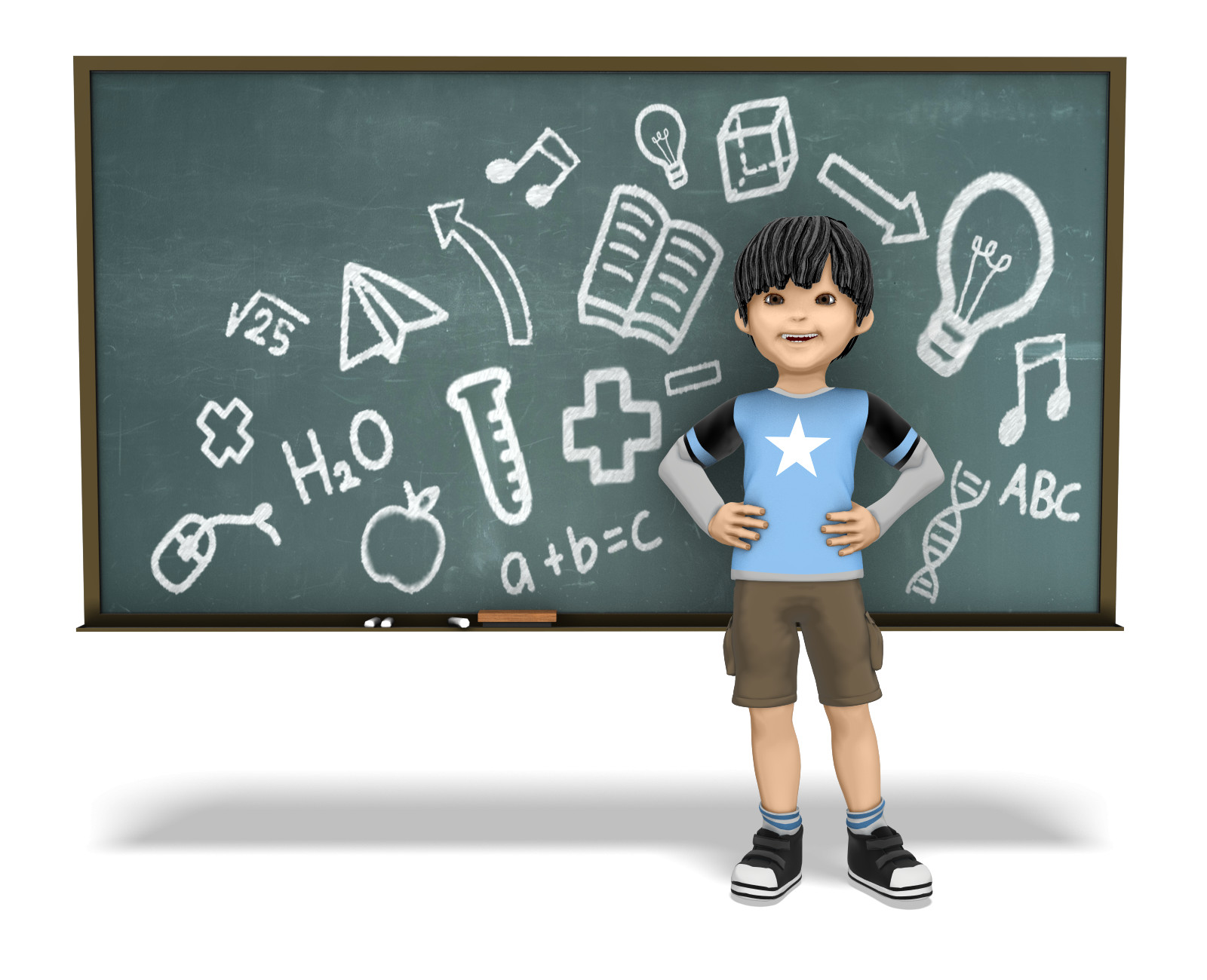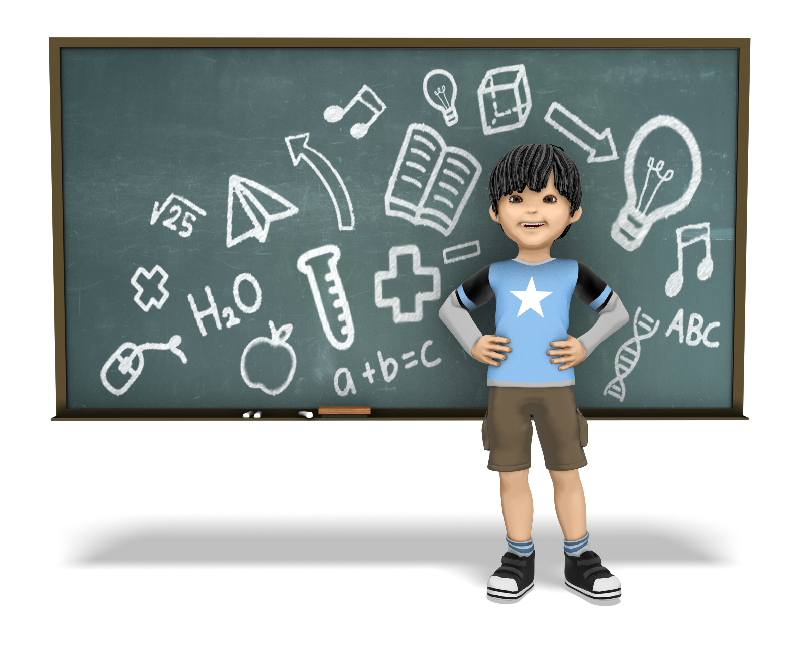 James young boy child kid character student smile standing happy pleased skintone joy tutor teacher scientist chalk chalkboard math science grammar school symbol learning alphabet equation
