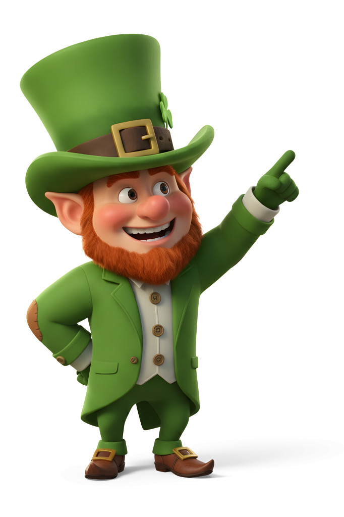 This vibrant image features a joyful leprechaun dressed in a traditional green outfit, complete with a tall top hat adorned with a shamrock. The character is animatedly pointing, suggesting he is directing attention towards something significant, embodying the spirit of celebration and luck associated with St. Patrick's Day. His bright red beard and playful expression add to the festive atmosphere, making this visual perfect for conveying themes of joy, tradition, and cultural heritage.