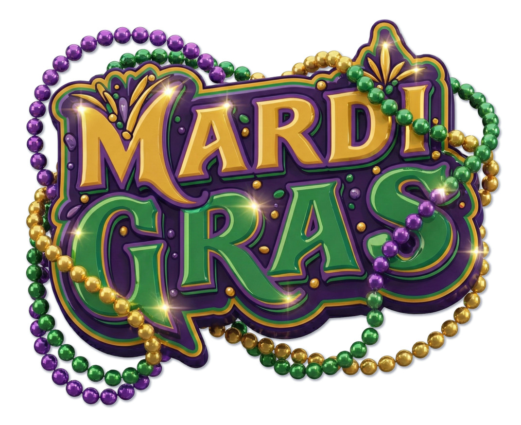 This clipart serves as a vibrant representation of celebration and joy, symbolizing the communal spirit and festive atmosphere of Mardi Gras. The colorful beads and sparkling title evoke feelings of excitement and togetherness, making it an ideal visual aid for conveying themes of festivity, cultural tradition, and joyous gatherings.