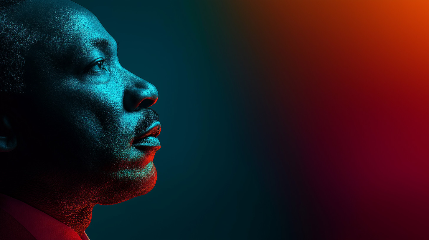 This striking PowerPoint background features a dramatic profile of a man, illuminated with vibrant hues of blue and orange, symbolizing hope and resilience. The visual elements evoke a sense of strength and determination, reminiscent of the legacy of Martin Luther King Jr.. The contrast between the colors highlights the profound impact of his message on civil rights and equality, making it a perfect backdrop for presentations focused on social justice, leadership, and inspiration.