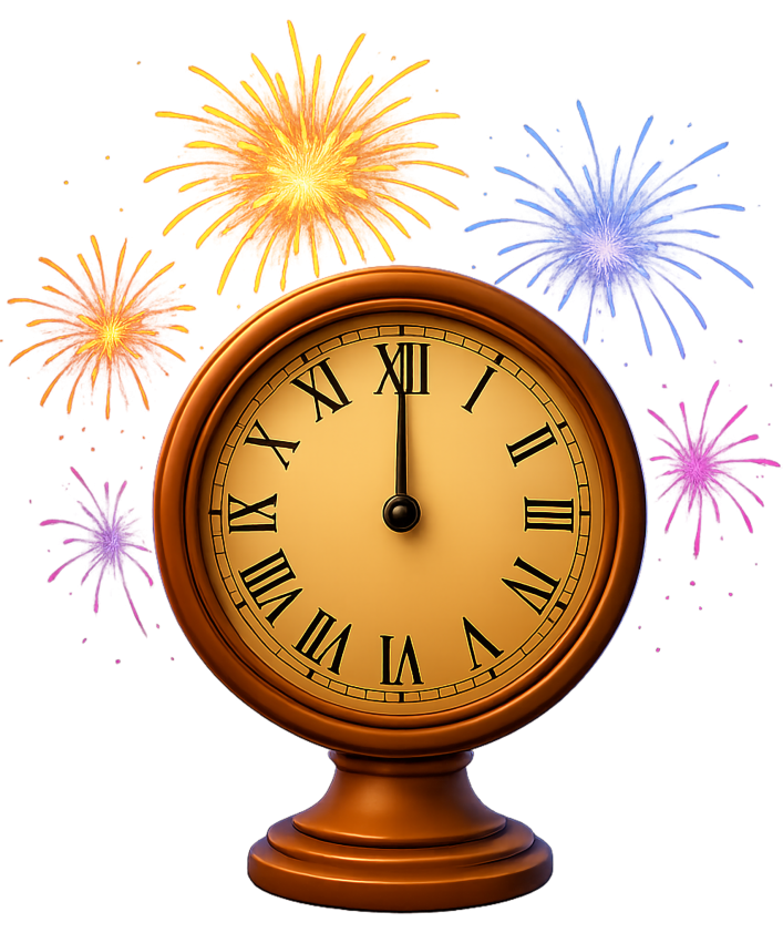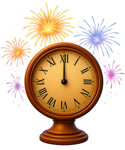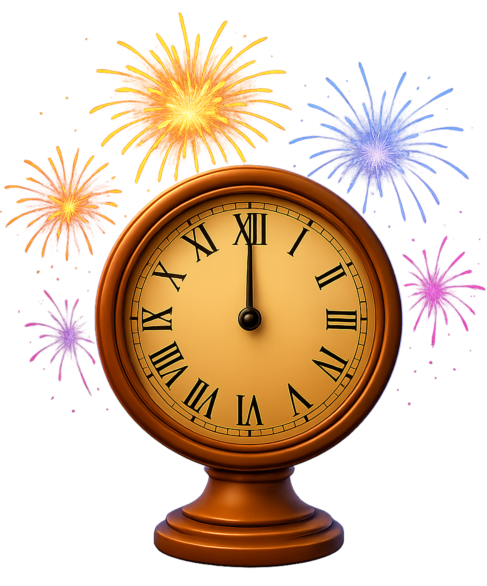 This vibrant clipart features a classic clock striking midnight, beautifully adorned with colorful fireworks in the background. The clock, with its golden face and Roman numerals, symbolizes the transition into a new day or celebration, making it perfect for New Year's Eve themes or festive occasions. The explosion of fireworks in shades of orange, blue, and purple adds a sense of joy and excitement, enhancing the overall festive atmosphere.