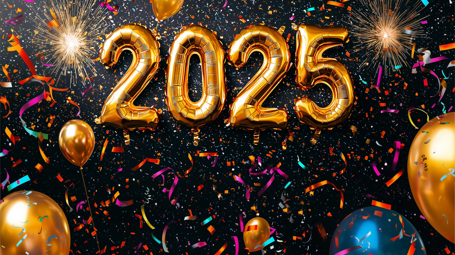 New Year, celebration, balloons, confetti, fireworks, 2025, festive, dark background, gold, colorful