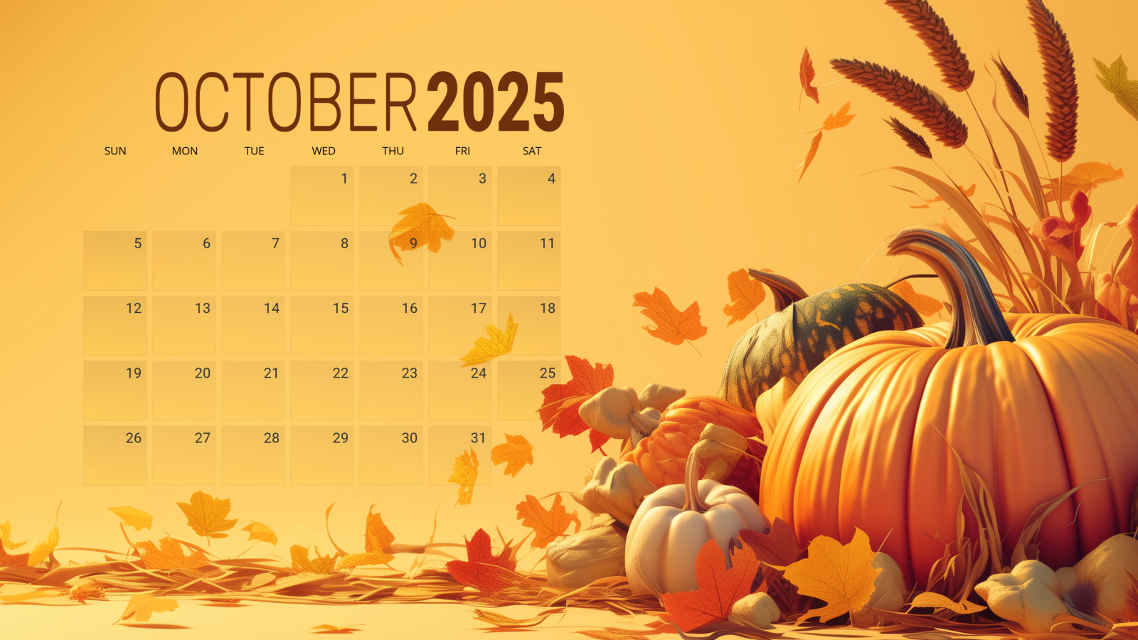 This calendar represents the transition into fall, highlighting events such as harvest festivals and Halloween. The imagery suggests a time for gathering crops and enjoying nature's bounty before winter. October is often associated with vibrant foliage and preparations for upcoming holidays, which are subtly referenced in this template's design elements. It encapsulates the essence of October's celebrations, changes in nature, and cultural significance.
