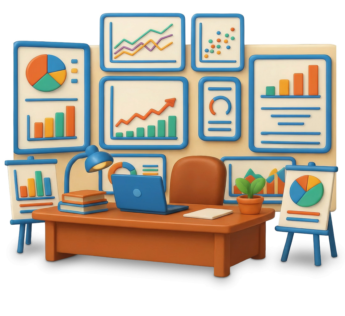 This dynamic office scene showcases a workspace filled with vivid data representations and analytics. The colorful charts and graphs on the wall highlight various data trends, making it an ideal visual for presentations focused on business intelligence and performance metrics. The arrangement of the desk, laptop, and plants adds an inviting touch, creating a productive atmosphere where data-driven decisions come to life.
