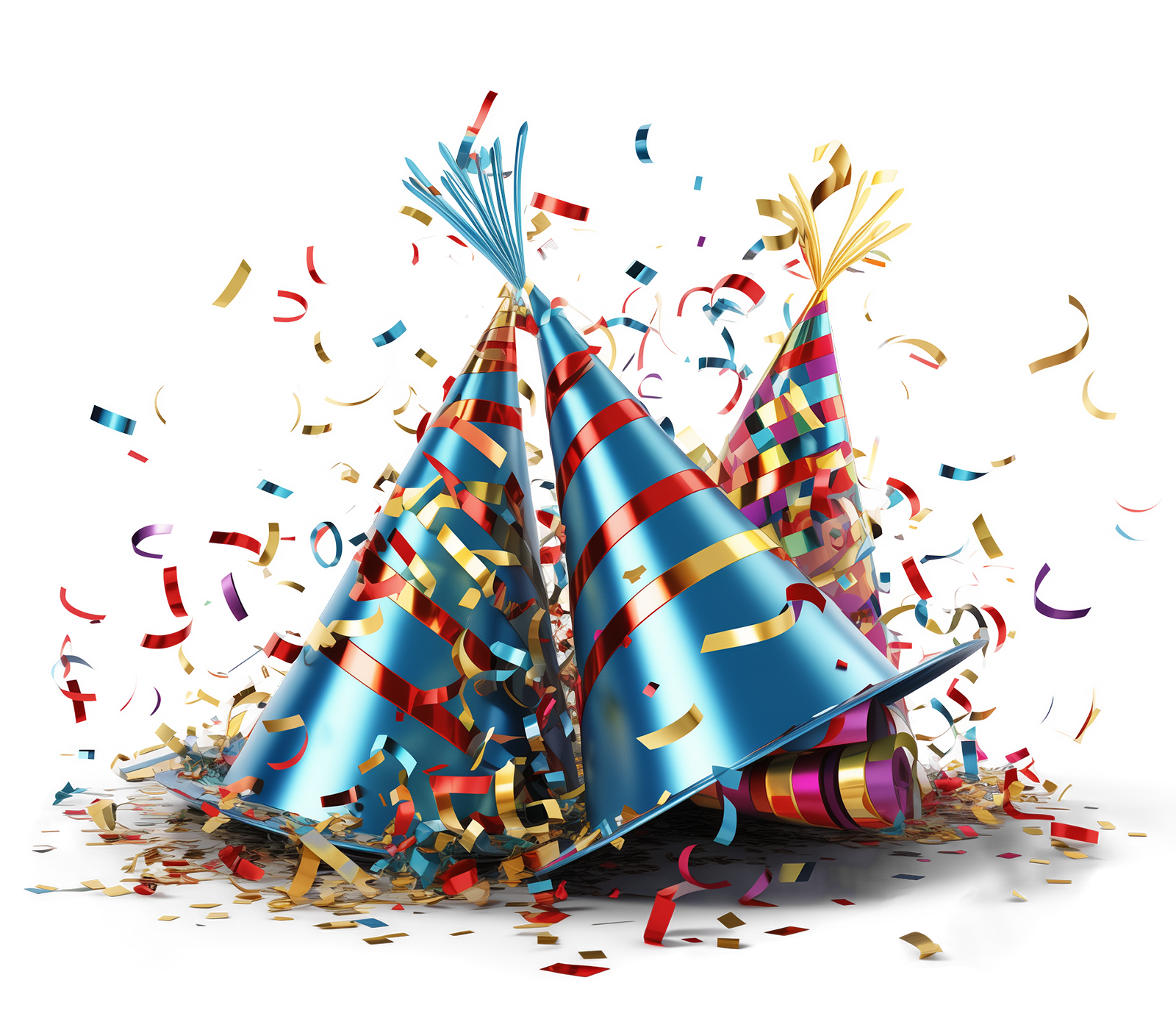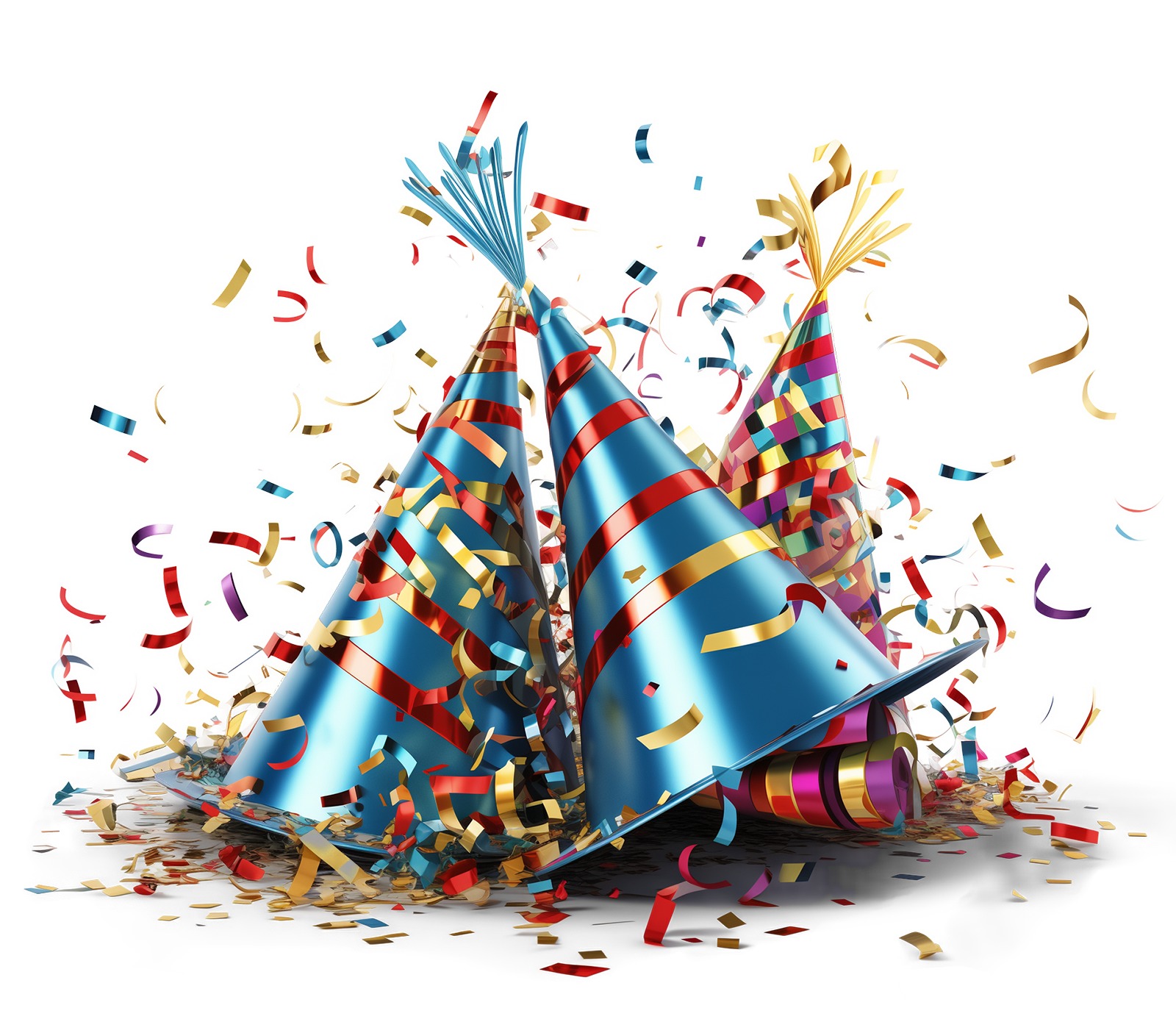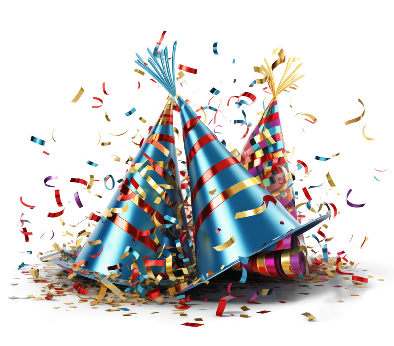 This image features an array of party hats surrounded by colorful confetti. The hats, adorned with stripes of blue, red, yellow, and white, are topped with golden tassels that add a touch of elegance. The scattered confetti in various shapes and colors enhances the festive atmosphere encapsulated in this image.