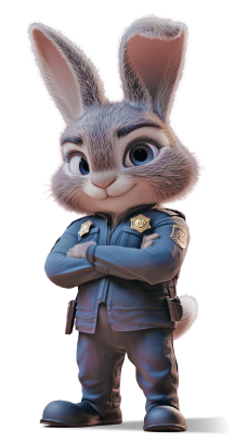This image features a cartoonish rabbit character dressed in a police uniform, standing confidently with arms crossed. The rabbit has large expressive eyes, prominent ears, and a friendly smile, embodying a sense of authority and approachability.