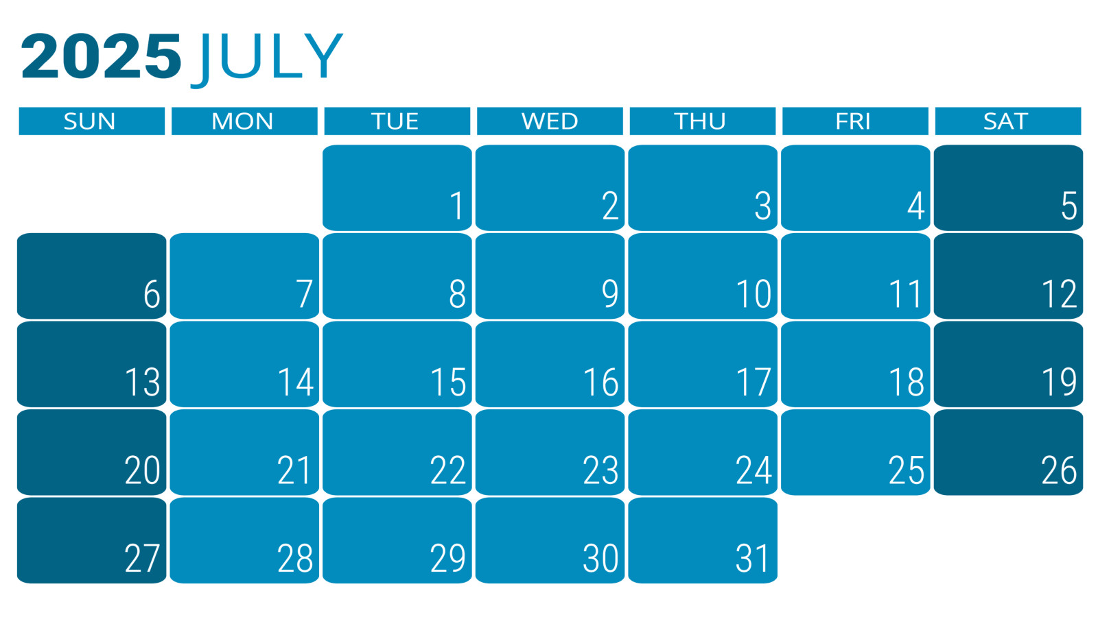 This image displays a calendar for the month of July 2024, with rows of blue rectangular cells representing each day. The days are organized from Sunday to Saturday, and the dates are clearly visible in white font against the blue background.
