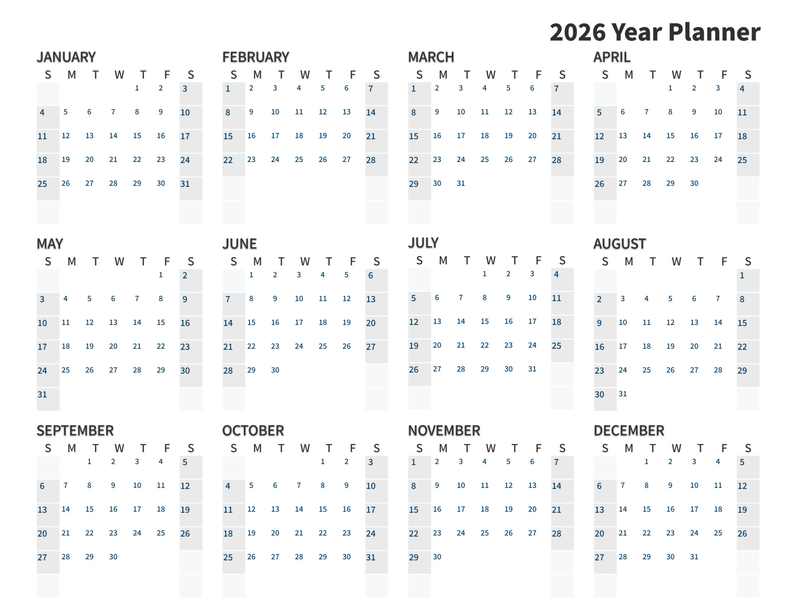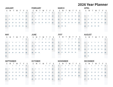 This 2026 Year Planner is a meticulously designed printable calendar that offers an organized view of the entire year. Featuring a clean layout, this planner is perfect for anyone looking to streamline their scheduling and enhance productivity. Each month is clearly outlined, allowing users to easily mark important dates, appointments, and events. The transparent background makes it versatile for use in various digital and print formats, ensuring it fits seamlessly into any presentation or document. This planner is an essential tool for personal and professional planning, helping users stay on track throughout the year.