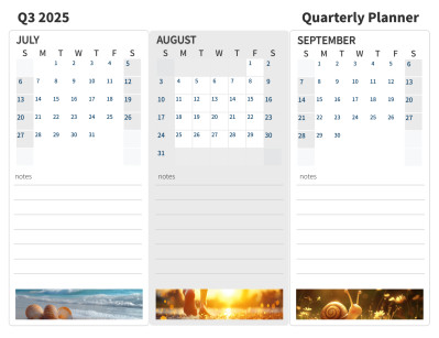 This Printable Q3 Quarterly Planner represents an organizational tool designed to help individuals plan their activities over the third quarter months of the year. It provides a clear visual layout of days and weeks, allowing easy scheduling and note-taking. The planner includes additional space under each month for important notes or reminders. The inclusion of seasonal images at the bottom adds an aesthetic touch, inspiring creativity and reflection on the transition through summer.
